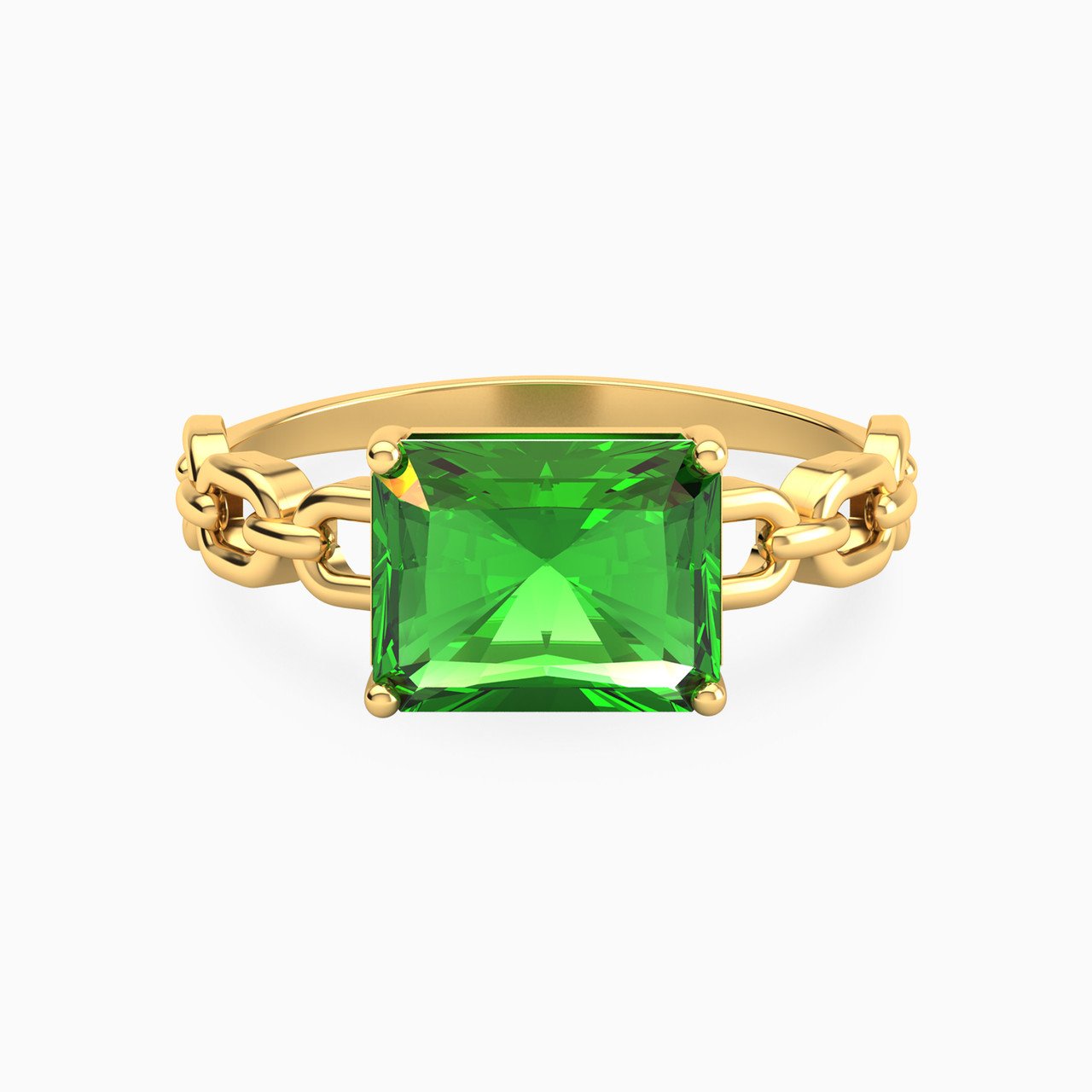 Prepare to dazzle them with every movement of your hand when wearing this stunning colored stone statement ring from L’azurde Gold. This gorgeous ring features an eye-catching baguette shaped colored stone at the center of a mesmerizing chain link 18-karat yellow gold band. We love this ring worn with a beautiful 18-karat yellow gold chain link bracelet or necklace for a look that captivates