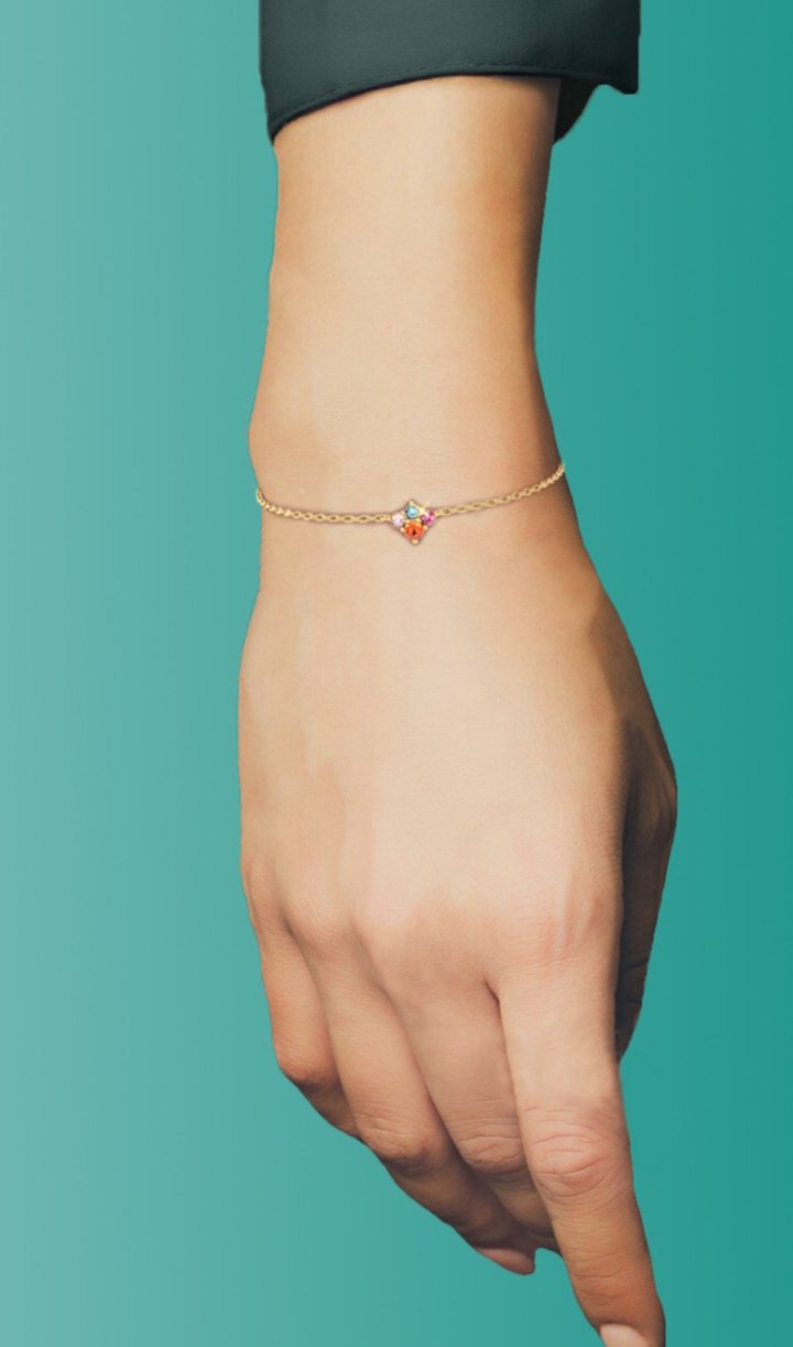 Wrap sweet sophistication and a pop of gorgeous colors around your wrist with this eye-catching colored stones bracelet from GOLDX. This chic bracelet is dainty and lovely, crafted in 14-karat yellow gold with a dazzling quartet of orange, pink, blue and fuchsia stones clustered at the center. We suggest wearing this piece with daytime and evening looks for easy-going elegance that gets noticed.