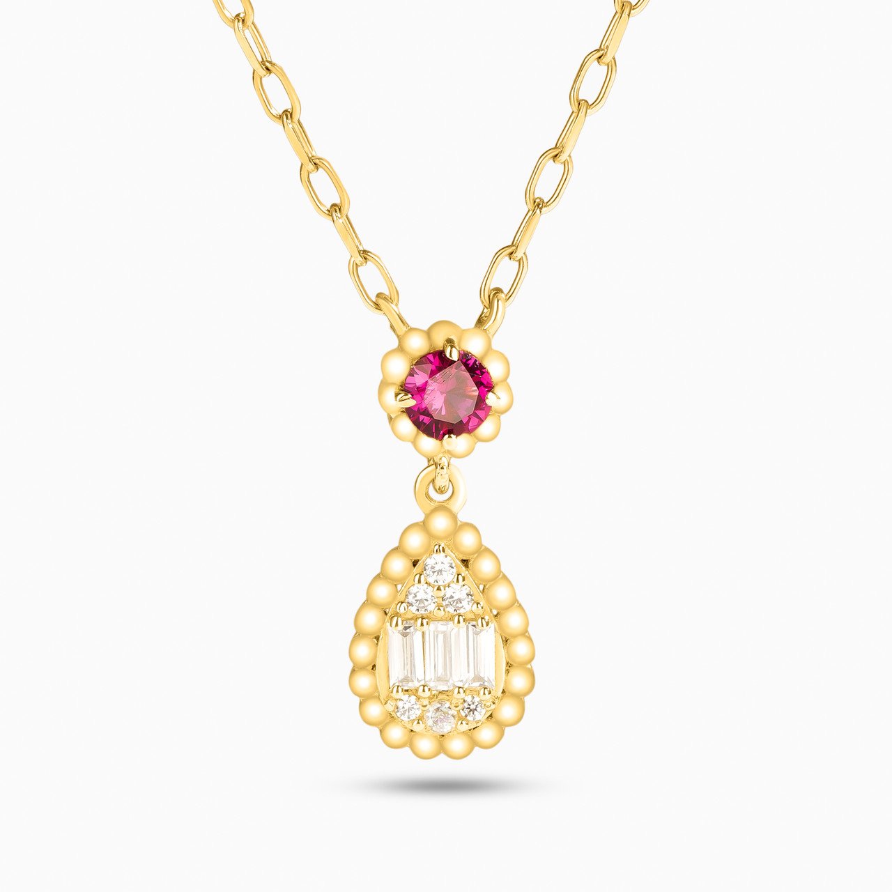 Elevate your style with this stunning 18-karat yellow gold pendant necklace from L’azurde Gold that’s sure to steal the spotlight wherever you go! It features a classic links chain that leads to a captivating pendant, featuring a sparkling round-shaped ruby red colored stone that instantly adds a touch of glamour to any ensemble. And to take it up a notch, a pear-shaped dangle, encrusted with sparkling cubic zirconia stones, adds a dash of elegance to complete the look, all framed with intricate scalloped detailing. This necklace is a statement piece that exudes sophistication and charm, making it the perfect choice for special occasions or when you simply want to shine.