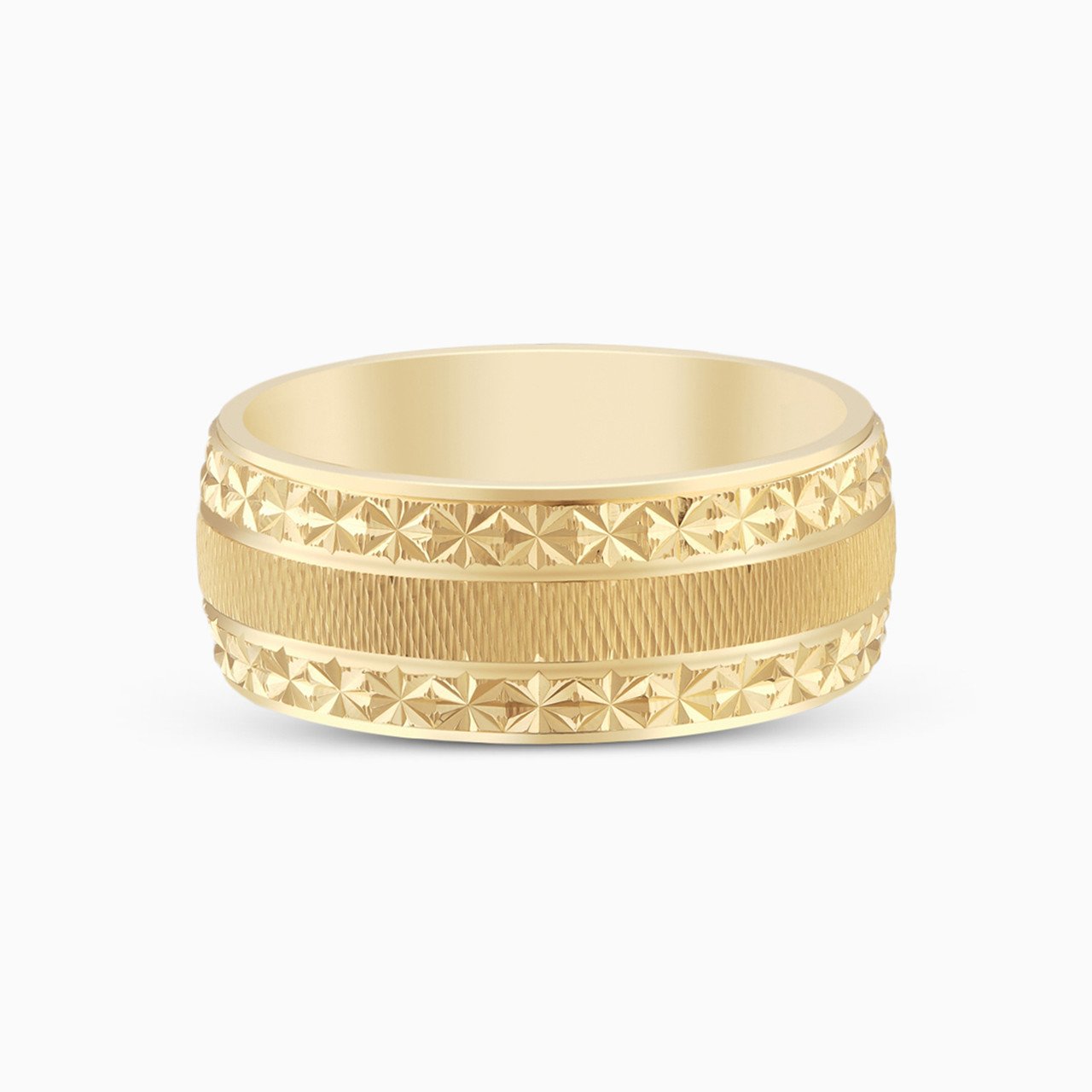Celebrate one of the most memorable days of your life by slipping this stunning wedding band from L’azurde Gold on your true love’s finger. Beautifully designed with intricate flower-like cuts along the edges and a textured center, this magnificent ring shimmers in 18-karat yellow gold. Eye-catching and luxurious, this gorgeous ring is sure to be cherished forever.